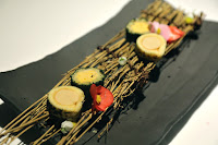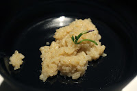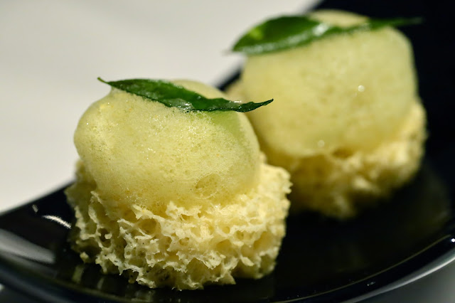 Idly sambhar - yet another new take, this time on a popular south Indian dish. Idly now comes as a fluffy sponge cake, topped with a sambhar-flavored foam and curry leaf. Very light and airy.