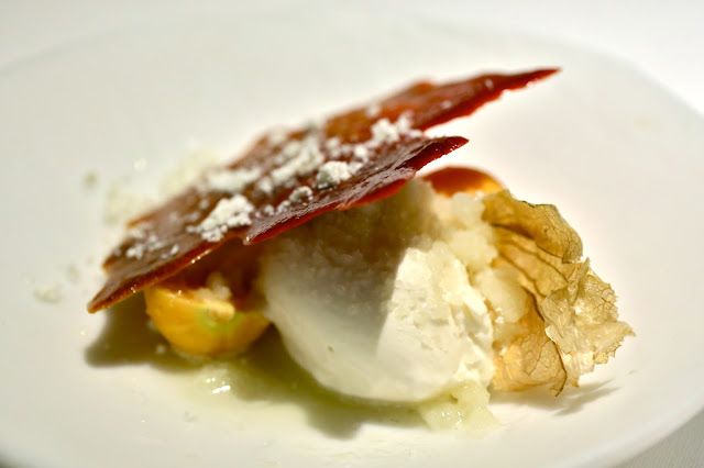 #Gohgan - created with Chef Fukuyama Takeshi (福山剛) of La Maison de la Nature Goh in Fukuoka (福岡市). Underneath the miso and caramel Canadian "maple leaf" was a quenelle of sake and vanilla ice cream, grape snow to provide some acidity, and finally cape gooseberries on the side for some serious tartness. Very good.