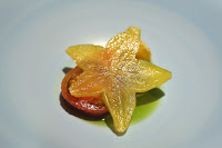 Red matcha - the bowl starts out with tomato, star fruit, and grape sitting in some coriander oil and black salt. This was to be consumed first.