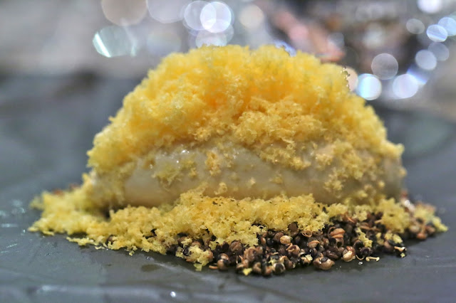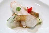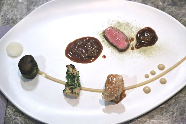 Baby lamb, fuyu, bamboo, water chestnut - this was the weakest dish of the evening, despite drawing inspiration from clay pot with mutton brisket (羊腩煲) - a local favorite in winter. Starting from the left is a disc of water chestnut pickled in Japanese vinegar; braised Chinese lettuce topped with shiitake mushroom roasted in beurre noisette; local bamboo shoot poached in olive oil; baby lamb brisket wrapped in tofu skin (支竹) and topped with lamb skin puff. The sauce streaking across the plate was made from fermented miso (isn't all miso fermented by definition?) and fermented tofu sauce (腐乳). At the top of the dish was a slice of roasted lamb loin, served with powdered konbu (昆布) to add a little umami/MSG. The puddles are basically sauce made from the lamb bones, with some chopped lamb skin.