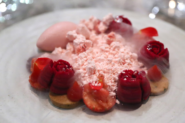 Strawberry, beetroot, rosemary, yogurt - a whole lotta different forms of all the ingredients, with macerated strawberries, candied beetroot, roses made from beetroot, rosemary sablé, quenelle of strawberry and yogurt sorbet; strawberry and rose royale snow in the middle.