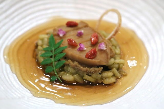 Abalone, goji berry, risotto,shirako - it's good that I took a second look the menu and noticed one of my few forbidden items on the list of ingredients for this dish! No fish cum for me, please!