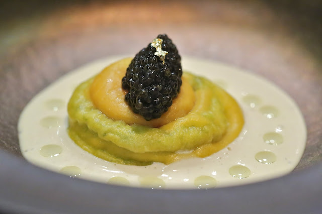 Egg, truffle, Parmesan, caviar - Taiyouran egg yolk raviolo on a bed of homegrown spinach and cheese mash, surrounded by Parmesan foam with truffle oil dots and topped with a quenelle of sustainable Italian white sturgeon caviar. Very rich and creamy. Very good.