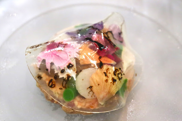 Tuna, Hokkaido uni, espelette, burnt cucumber jelly - the first dish certainly made a real visual impression. A bed of tuna tartare with piment d'espelette emulsion and mixed with crispy multigrain, topped with tongues of Hokkaido sea urchin, discs of fermented radish, cucumber discs and balls, multi-colored edible flowers, scallion purée, and covered with a layer of cucumber jelly.