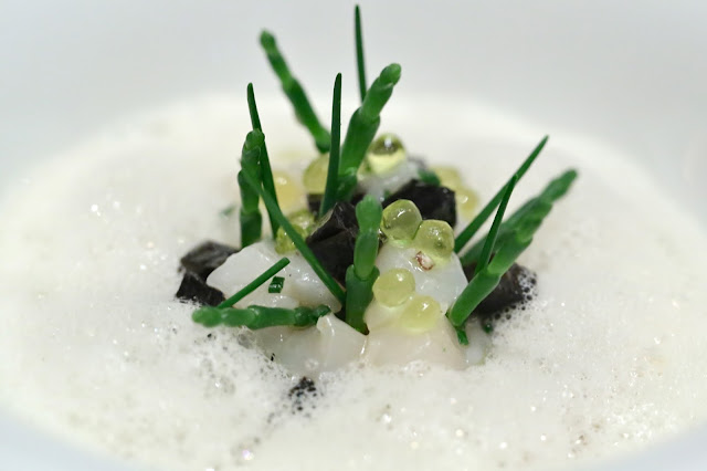 Jerome Galis green asparagus: with raw and marinated kibinago, seaweeds, nori purée, seawater foam and matcha - my first bite of green asparagus from Jerome Galis came last year and it was a revelation. My first bite of this particular spear brought back those memories... fresh, sweet, and vibrant. Served with seaweed, salicornia, and silver-stripe round herring (黍魚子) on top. Definitely tasted flavors of the sea... especially from the herring... not to mention the nori (のり) purée on one side as well as the seawater foam with matcha (抹茶) powder on top. A beautiful dish.