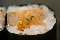 Since none of us wanted tuna, the chef had to think about what kind of roll to serve us. He decided to wrap long, thin strips of golden cuttlefish (墨烏賊) that has been aged for 1 week, along with spicy pollock roe (辛し明太子) and perilla leaves. Yum.
