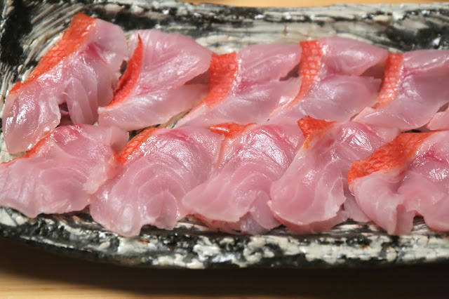 Golden alfonsino shabu-shabu - we were curious to find this plate of golden alfonsino (金目鯛) on the table, because it didn't look like a sashimi course.