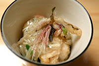 Icefish with shirona and grilled mullet roe - a pile of icefish (白魚) sat on top of a vegetable from Kyoto called shirona (しろ菜), which isn't exactly the same as bok choy (白菜) or cabbage. A nicely grilled slice of mullet roe (カラスミ) came on the side. A little sprinkle of sesame seeds make things complete.
