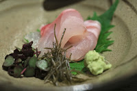 Aged sashimi: tilefish, 7 days (お造り:白川) - this was actually a type of tilefish called shirakawa (白川 or 白甘鯛). Instead of soy sauce, this was dipped in saltwater flavored with konbu (昆布). Also served with chiffonade of konbu and young red shiso (赤紫蘇) leaves.