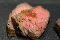 The beef comes from a breed of cattle called Mukakuwagyu (無角和牛), which literally means "hornless Japanese cows". This is a type of breed that has gone out of fashion for the last 60 years or so, as people's preferences veered toward cattle with more marbling. It's easy to see that the meat was pretty lean and without much fat. Very nice "beefy" flavors.