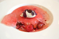 Carbonated red grapes, white peach parfait, honey ice cream on raspberry ice - we were asked to break the top layer of raspberry ice to get to the contents below.