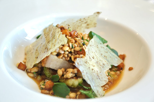 "Granola" of wild grains, black garlic tapenade and kurobuta pork belly with black truffle, potato skin-cacao broth - don't recall being told which part of Octaphilosophy this was, but possible 'texture'? A savory version with lemon confit, multi-grains on top of tranches of delicious pork belly. There were also Brussels sprouts and pearl onions in the mix. Yum.