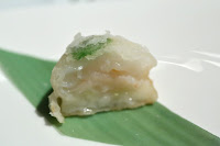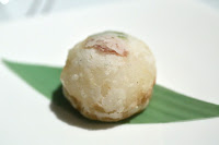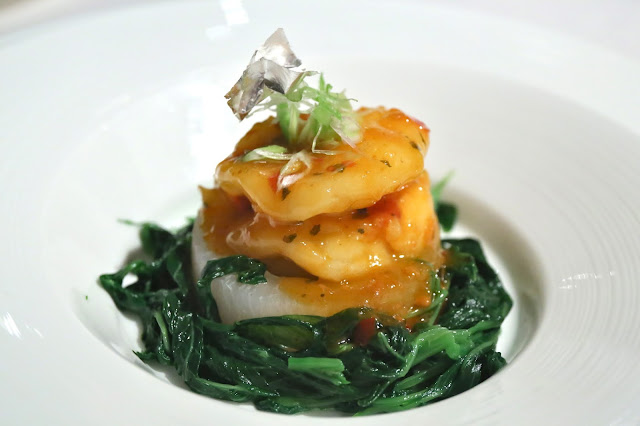 Simmered King Prawn with Seafood Sauce (梅辣蝦球皇) - and things get worse from here. Crystal king prawns (玻璃蝦) makes frequent appearances on fine dining menus, but the classic Cantonese preparation has it cooked in superior (ham) broth. Drizzling hot and sour sauce on it doesn't make it unauthentic, but in my opinion it panders to gweilos who think that Chinese food means hot and sour soup (酸辣湯) and kung pao chicken (宮保雞丁). And what's with the silver foil on top?!