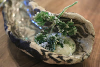 Deep-fried mushroom nori roll, algae powder, oba vinaigrette - I can't believe that, in 2016, there are still chefs who think having diners injecting something into the food by squeezing a pipette is still cool. It's the kinda shit I hated about Richard Ekkebus' cuisine at Amber back in 2007, and Richard outgrew that years ago...