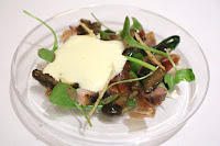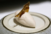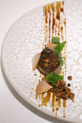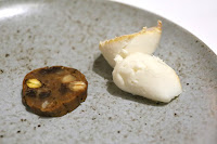 'BBQ' pigeon Fabien Deneour: petit pois, roasted porcini, pickled cherry - now this looks familiar... n'est-ce pas? The pigeon with the stretched out confit leg... extending its middle finger at the diner - in a last act of defiance, in death. The execution of the breast was perfect for me. It even came with half a heart... which oozed out blood when I applied pressure with my knife. The confit cherries were very yummy, as was the foie gras coulant with liquid foie gras inside.