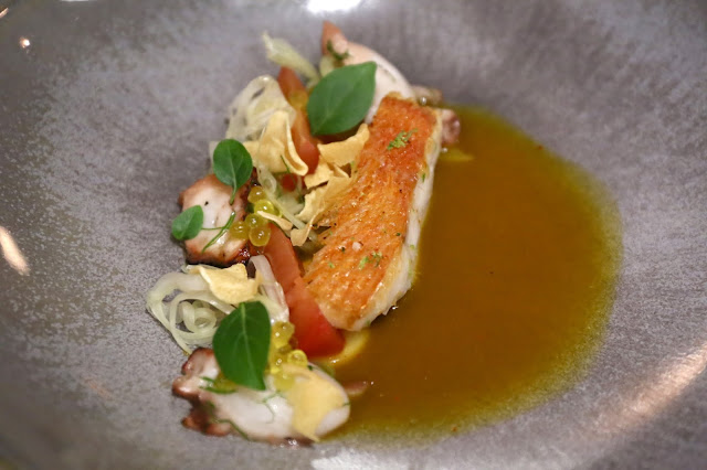 Crispy-skinned Japanese kinmedai: charred Fremantle octopus, cupidon tomato, fennel and bouillabaisse - I always like golden alfonsino (金目鯛)... especially when the skin is crispy. And having with bouillabaisse is perfect. I liked the texture of the octopus with fennel, and the added fragrance from olive oil caviar.