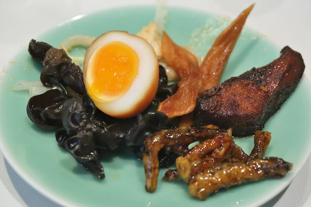 Zhejiang Heen signature appetizers: smoked fish, black fungi in Zhejiang vinegar, pickled radish, Ningbo crispy fried eels, transparent bean noodles with shredded chicken, smoked egg (浙江軒冷盤:長江燻魚, 香醋雲耳, 醬香蘿蔔, 寧波脆鱔, 雞絲粉皮. 煙燻蛋) - so we start out with a plate full of different appetizers. The smoked fish was not too sweet, had a pretty crunchy exterior but remained pretty soft inside. Black fungus came with good acidity from the vinegar. The pickled radish was pretty salty with a little sweetness and a hint of spice on the finish. The crispy eels were pretty tasty. The noodles were OK, and the smoked egg wasn't bad.