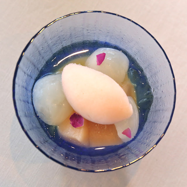 Almond tofu with peach compote fresh lychee and "monkey picked" oolong tea jelly scent of rose flower - this was the incredible dessert I had on my very first visit here. In fact, we asked Sato-san for a second serving on that visit. That's how amazing it was. Well, the lunch portion today is a lot smaller than those first two bowls, but I still love it. The lychees today were sweet, but unfortunately not quite as amazing that the ones from that batch last year. Nevertheless, the mélange of lychees, peaches (and peach sorbet), almond tofu (杏仁豆腐), Monkey picked Oolong tea (馬騮搣) jelly, and rose was simply beautiful. I could have had 4 of these...