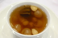 Double-boiled ginkgo nuts and lotus seeds (銀杏燉湘蓮) - a wonderful end to dinner... with jujube, longan, lotus seeds, ginkgo nuts, and apricot kernels.