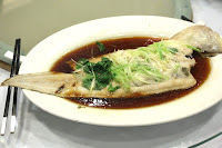 Steamed sole (清蒸海方利) - tonight we've got two of these soles, each weighting one catty-plus. This means that the cooking time was reduced, which would explain why the meat from the back was more tender than usual. Very nice.