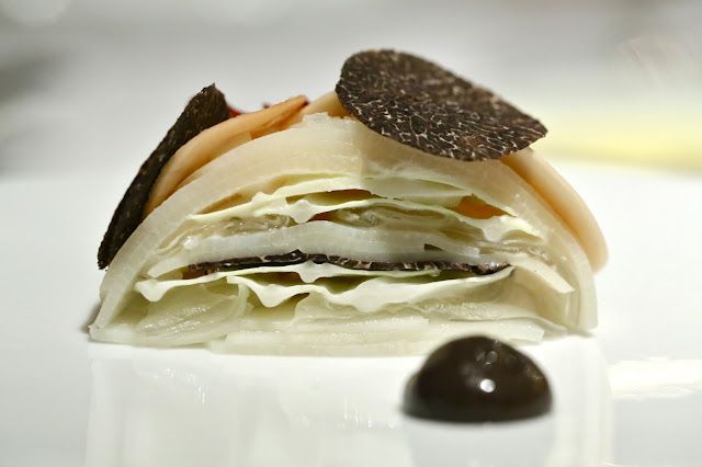 Green bamboo shoot, winter black truffle of Australia, salted pork, white fungus - this "millefeuille" was possibly my favorite dish of the evening. The thin slices of summer bamboo shoots from Yangming Mountain (陽明山) were very sweet and juicy, with clean and refreshing flavors. There were also layers of white fungus, crunchy cabbage, and black truffle. Apparently somewhere in there was also salted pork purée, but I tasted no trace of it. There were, however, crunchy slices of dried salted pork on top, as well as thin discs of what seemed to be white button mushrooms. The "dot" on the side was made with truffle jus, truffle oil, fresh truffle, and Sherry vinegar.