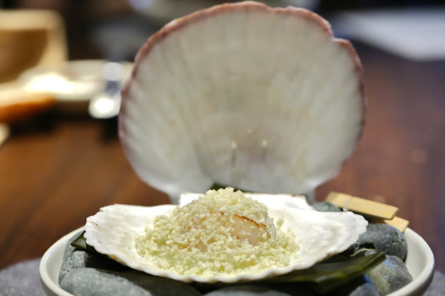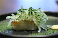 Scallop, cauliflower couscous, spicy ponzu - a layer of sweet cauliflower purée sits below the Hokkaido scallop, while a sprinkle of cauliflower 'couscous' is sprinkled on top to provide some crunch. The spicy ponzu (ポン酢) actually provided some citrus flavors which reminded me of aged mandarin peel (陳皮).