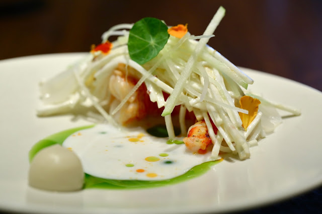 Buttermilk, remoulade, gamberoni - the prawn was topped with julienned green apple, celery, and celeriac, along with nasturtium flowers and leaves. Buttermilk was then poured onto the plate, and gradually mixed with celery oil and olive oil. Celeriac purée on the side was a little smoky.