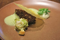 Red quinoa, oyster Bearnaise, smoked cabbage - a "surf-and-turf" dish. The curry-flavored translucent cabbage wafer covered up most of the dish, except for the oyster-flavored Bearnaise and the spinach/wasabi foam.