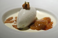 Our pre-dessert was vanilla panna cotta with honey yogurt sorbet and apricot compote. The "panna cotta" was actually not solidified but rather liquid. The sorbet was very rich and creamy, and the very sour apricot compote helped with that.