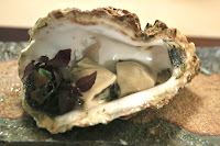Rock oyster, seaweed (岩牡蠣 海苔) - June to August is the best season for the Japanese rock oyster coming from the deep seas around Mie Prefecture (三重県). The texture was kinda crunchy, and the flavors were more briney and less creamy than I had expected. The pile of nori (のり) seaweed underneath the purple perrilla leaves was really, really delicious.