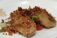 Wok-fried de-boned pig trotters with mashed ginger, chili and crispy garlic (避風塘無骨豬手) - I was lambasted for having this dish on the menu... as it totally destroyed any palate for wine. To be fair, though, I wasn't exactly the first to serve up something with lots of deep-fried garlic and chili... although I do have a history of serving dishes at MNSC dinners that don't work with red wines... In any case, I found this dish to be totally delicious! In spite of Pineapple's refusal to eat this and the Ox choking on the chilis, the wonderfully soft texture and the yummy flavors from frying everything was to die for.