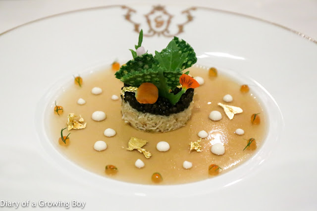 Le tourteau des côtes bretonnes assaisonné d'une crème de chou-fleur, gelée de homard surmontée de caviar impérial de France - this was it. This was the itch I had come to scratch. Xavier's variation of the famous creation from Joël Robuchon. All the key ingredients are here: lobster jelly, cauliflower cream, crab meat, caviar, and of course gold foil... along with a couple of extras like salmon roe and the buckwheat tuile colored with seaweed.