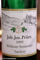 1995 Joh.Jos. Prüm Wehlener Sonnenuhr Auslese - lots of petrol, polyurethane, and marmalade. Good amount of sweetness on the palate, balanced by some acidity.
