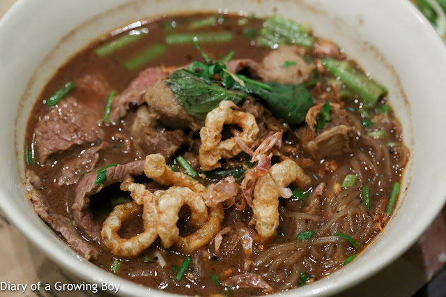Wagyu beef boat noodle w/thin rice noodles, pork rinds and Siamese watercress - the flavors here were pretty rich, and got the thumbs up from the native. I'm not really sure whether the slices of beef or the meatballs were really made with wagyu, but it didn't matter much to me. There were plenty of deep-fried shallots and other garnishes adding flavors, and of course I thought they didn't give us enough of the deep-fried pork rinds...