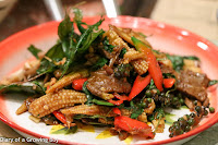 Stir fried wagyu beef w/ wild ginger, garlic, chili and red basil - this was the most spicy dish tonight, as I couldn't avoid all the chili seeds and flakes which had stuck to the slices of beef.