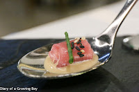 Our amuse bouche tonight was veal with wakame and wasabi mayo. I didn't see any wakame, but I think the green stick may have been a salicornia?