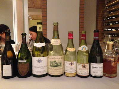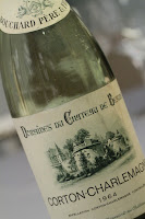 1964 Bouchard Corton-Charlemagne en magnum - a little green and vegetal, grassy. Could it have been a little corked? Acidity still here. Somewhat elegant but a far cry from the other magnum from 4 years ago. Served about an hour after decanting.