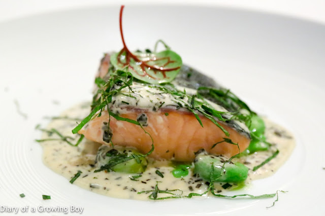 L'Adour salmon confit with mint, tarragon, truffle, and fava beans - a special of the day. Apparently the best season for wild salmon captured as they swim up the Adour River only lasts about a month, so we were pretty lucky. This was the same type of salmon that I had seen Chef Alain Passard serve my friends in his private garden.