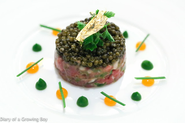 Tuna tartare tart - with salmon roe, diced cucumber, and dill.