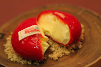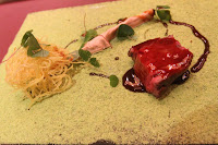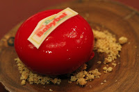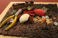 The Brick - finally we get our chocolate fix… A piece of opéra served with coconut sorbet, raspberry sorbet, sponge cake, marinated cherries, a pair of pliers made from chocolate… all served on a chocolate "brick". The cherries were really delicious, and so was the brick… which was basically a layer of chocolate-covered corn flakes. Oh and there were some chocolate-coated coffee beans, too.