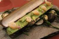 Clam - Japanese razor clam on a bed of potato (and pea?) cream, garnished with leeks, dill and flowers. The razor clam was one of the best I've had in recent memory, although it's pretty hard to top the beautiful creation from Philippe Rochat…