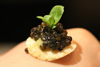 Hand - a playful nibble I tried out a few months ago. A tiny lump of caviar sits on top of a melba toast, stuck to one's hand with a dollop of sour cream. Lick in one mouthful.