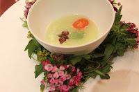 Summer - the summer soup had cucumber panna cotta at the bottom, which partially dissolved once the tomato essence was poured on top. Served with basil, perilla leaf and a flower that tasted somewhat like garlic…