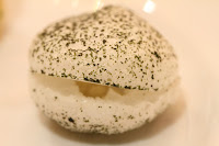 Seaweed and oyster macaron - with oyster "ganache" that was full of metallic flavors.