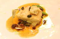 The sea bass came wrapped in cellophane and had been cooked with dates, figs, pistachios, almonds, saffron, asparagus and cauliflower. Definitely very Middle Eastern flavors, like a tagine or even reminds me of the halwa I had in Oman.