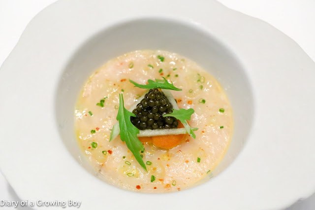 Langoustine: minced over airated aka uni, schrenki caviar, poached jicama, kabu and Granny Smith fricassée - COULD THIS BE? IS THIS THE NEW 'HOKKAIDO SEA URCHIN'? At first glance this seemed to have all the right ingredients...