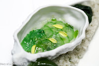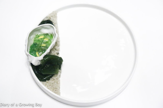 David Hervé 'Ronce" oyster: over a plankton gel with organic kale, seawater and organic lemon jell-O, mustard cress bloom - we were advised not to ingest the kelp and the salt on the plate...