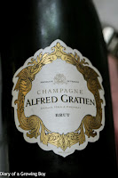 We started with a glass of Alfred Gratien Brut, whose nose very caramelized, quite mineral. Very full on the palate, with very high acidity and a grippy finish. Definitely showing the meunier side.