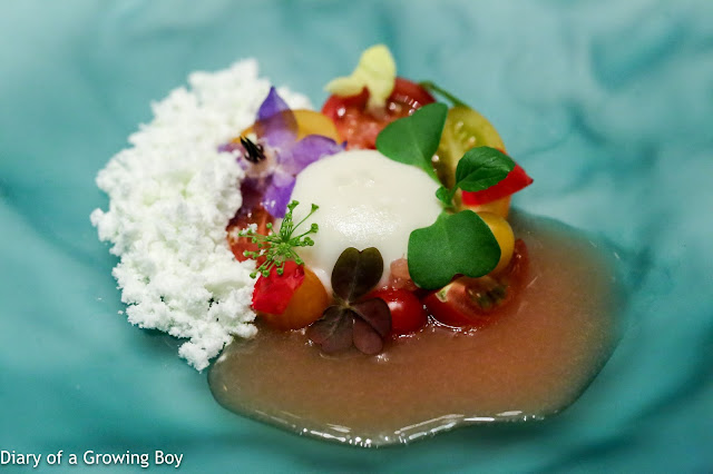 Heirloom tomatoes: pickled rose petal, solidified basil infused extra virgin olive oil, stracciatella di bufala, finger lime, watermelon and tomato water - surrounding the tomato water-infused stracciatella in the middle were four different types of heirloom tomatoes, with rose petals, edible flowers, and herbs. The watermelon and tomato water poured on the side was a mix of sweet and savory, while the 'snow' barely had any basil flavor. A very pretty dish, and tasty, too.