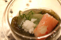 Mozuku in vinegar with snow crab (もずく酢 ずわい蟹) - always refreshing to start with something cold and acidic in the summer, and the snow crab leg was nice and sweet. Also with cucumber slices and little chunks of Japanese yam (山芋).